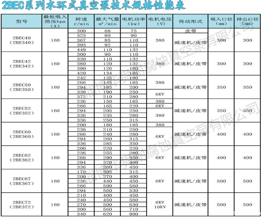 2BE系列水环真空系及压缩机,是我公司在多年科研成果和生产经验的基础上,结合国际同类产品先进技术,研制开发的高效节能产品,通常用于抽吸不含固体颗粒,不溶于水,无腐蚀性的气体,以便在密闭容器中形成真空和压力。通过改变结构材料,亦可用于抽吸腐蚀气体或腐蚀性液体做工作液。广泛用于造纸、化工、石化、轻工、制药、食品、冶金、建材、电韵、煤暖、金属矿山、化等行业。本系列泵采用单级单作用的结构形式,具有结构简单,维修方便,运行可,高效节能的优点,并能适应排水量大,载荷冲击波动等恶劣工况。我们对关键部件,如分配板,叶轮和系轴进行了系列优化设计,简化了结构,提高了性能,实现节能。采用球墨铸铁或焊接叶轮,叶片一次冲压成形,型线合理:轮毂全部加工,从根本上解决了动平衡问题。叶轮与系轴采用热装过盈配合,性能可靠,运行平稳。叶轮焊接后,整体进行热处理,使叶片具有良好的韧性,叶片的抗冲击,抗折弯能力得以根本保证,能适应载荷冲击波动等恶劣工况。2BE系列泵,自带气水分离器,多位置设有排气口,泵设有排气检修口,叶轮与分配板间通过定位轴承两娉压益调整,安装使用方便,操作简单,便于维修。