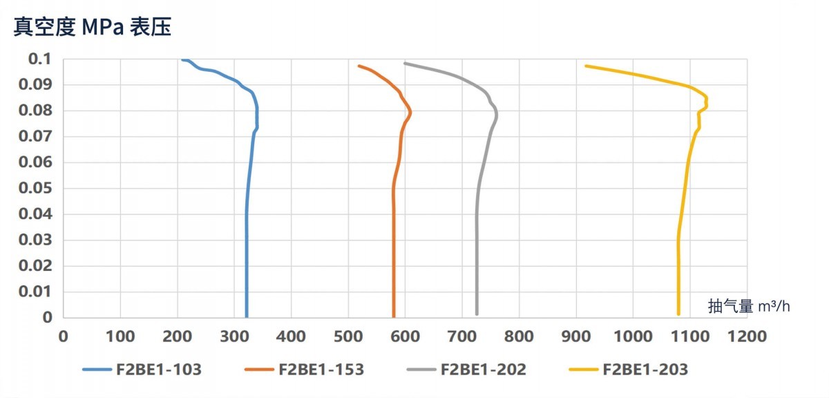 F2BE系列耐腐蚀真空泵可满足246~1380m/h的中高抽气量区间,其限度真空度也更高。采用弯曲叶轮设计,泵腔配备了一个单叶轮,上偏心设计,曲叶轮形成的液环流速稳定,湍流少,适用于大抽气量、高真空度的工况。相比径向叶轮,弯曲叶轮形成的液环,气液掺混较小,整体压差更小,可以实现气体的吸入和压缩,能量利用更好。