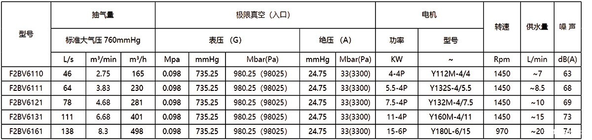 2.上列性能基于进气温度20℃,进水温度15℃,排气压力1013hpa的条件,被吸入气体为饱和空气。(饱和空气是指在对应吸入状态下,其相对湿度为100%的湿空气。)3.抽气速率、轴功率性能允差10%。